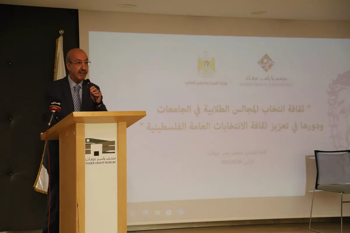 احتضن متحف ياسر عرفات، ندوة بعنوان: "ثقافة انتخاب المجالس الطلابية في الجامعات ودورها في تعزيز ثقافة الانتخابات العامة الفلسطينية"، بتنظيم من مؤسسة ياسر عرفات ووزارة التربية والتعليم العالي، اليوم الإثنين الموافق 2025/09/29، بحضور عدد من عمداء شؤون طلبة الجامعات الفلسطينية، وعدد من المؤسسات الشريكة، وأكثر من 100 طالب/ة من مختلف الجامعات.